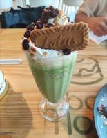 抹茶smoothie口感绵密又带着抹茶香味,上面的饼乾还可以沾着smoothie一起吃~