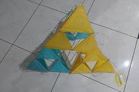最后上完课程,再做完剩下的12个小型正四面体风筝,并做成三个中型正四面体风筝,再组成一个大型的正四面体风筝。中间过程没办法拍照,因为胖比(6Y5M)从剪麻绳到绑吸管,已经做了90分钟了,差不多到极限了,开始呼叫妈妈「我需要帮忙~~」,所以妈妈最后也是舍命陪胖子(子念三声)。一起分工合作,大约一个小时完工: