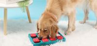 像是拼图式餐盘就相当适合,狗狗需挪动拼图或咬起遮蔽物,才能吃到饲料,藉此训练牠们思考。