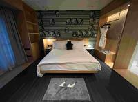 电梯一出来就是满满的黑绿色系丛林感,一只巨大卡比兽就在电梯口望着你。电梯至房间的走廊上,一样都充斥着丛林感的装潢,蛮用心的,入住房客可以尽情与卡比兽拍照。