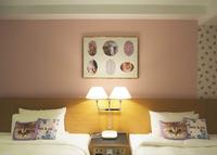房间内部以粉红色及象牙白作为主要的配色,壁纸上印有品牌设计师Sophie的爱猫也是品牌标志性的图样猫咪Gipsy。