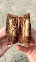巧克力塔的塔皮不会湿软??最上层的巧克力酱超浓郁!内馅有一些脆脆的有点类似榛果酱咬起来咔滋咔滋口感很加分?