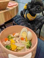 宠物餐只要170,有花椰菜、红萝卜、地瓜、水煮蛋、鸡肉、鸡软骨。餐点放在可爱粉红色有蝴蝶结的碗里,看起来更加诱人可口。