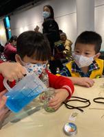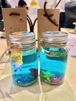 来做Diy,做「蓝色海洋梦」,把沙子、蓝色水、油、装饰品放入,最后保丽龙胶黏盖就完成✅