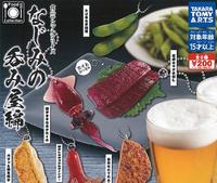 ▲文宣打着「只要和钥匙系在一起,就不容易忘记钥匙唷!」,是一款烤鱼类的钥匙圈盒玩。左至右分别是「鱿鱼」、「风乾竹筴鱼」、「鳗鱼」、「鳕鱼子」、「七轮」(炭炉)。#食物盒玩 (6)熟悉的路边摊下酒菜