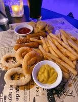 #银河炸物拼盘$399里面有薯条、鸡块、起司条跟洋葱圈,虽然炸得还不错,但觉得四样近400元⋯⋯