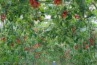 蕃茄园走道较窄长要小心不要撞到水果,蕃茄树枝桠盘旋两侧棚架至上方围成花圈般的走道,这画面还挺美的。