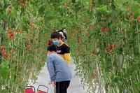 兄弟两认真挑选新鲜又转红成熟的小蕃茄。