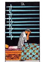 ●在伟特塔罗牌的「宝剑9」中,可以看到一位女子像是做了恶梦后,从床上坐了起来,掩面的样子。墙上镶了9把宝剑,代表了「伤害」,女子掩面代表了「不愿面对真相、难过」,左下方床板上有一幅两人在争斗的雕刻,代表了「痛苦」。抽到此张牌,代表现在的处境或是环境,可能充斥着令你感到痛苦的回忆、要素,也可能有工作压力太大失眠的情况。在情感中则代表「可能被欺骗、不忠」,除了改变、离开有害环境外,也需要你勇敢面对,克服困难。