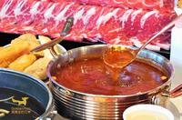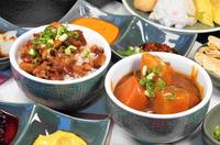 嗑肉石锅主食也超级有诚意的,提供了多达十来种的饭、面可以选择,其中这又油又香的卤肉饭还有咖哩饭光是看上去就受不了,特别是卤肉饭再淋上一旁的川味麻辣酱汁更赞