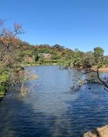 春季有300棵樱花树盛开赏樱期间会举办「赏樱之夜」三重塔等建筑会打上灯光夏天的睡莲和绣球花冬季的梅花春天的杜鹃秋天的野菊、红叶、石蒜、池塘、小河、散步小径让你以为身在京都的错觉