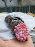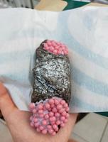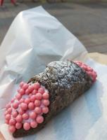 首先先来看看外观的部分。洒上糖粉的巧克力派皮,两侧醒目而突出的颗粒则是草莓口味巧克力球。