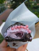 巧克力派皮的味道浓厚且口感酥脆,入口即化的草莓巧克力球加上蓝莓奶油的酸甜让味觉体验更丰富,此外中间夹层的蓝莓酱则让人惊喜,是一款实际比想像中还美味的甜点,不过因为整体偏甜所以建议搭配无糖饮品享用!