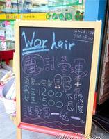 门口有黑板注明试营运超值活动,男生烫或染发1200元不分长短含洗剪、