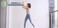 将双脚打开与肩同宽,同时抬起双手与地面平行,向左右两侧往下伸展,挤压左右两边的腹部!这个动作可以训练到侧腰,记得在做的时候要保持身体挺直喔!左右两边轮流,维持30秒。