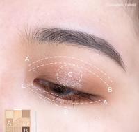 ✍沾取''A"当作打底色大范围晕染✍沾取''B"以水平的方式叠加在眼褶内✍沾取''B"当作阴影色在卧蚕下缘晕染出阴影简单化出『伪卧蝉』✍沾取''C"叠在中间处及眼下卧蚕处,可达到提亮的效果✍最后涂上棕色眼线及睫毛膏就完成啦!!