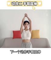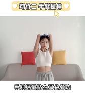 首先双手向上打直后相扣,手肘尽量贴在耳朵旁边,保持大臂垂直於地面,然后小臂向下屈伸,这个动作可以消除我们手臂后侧容易堆积的肉肉,能够紧致手臂线条,一组重复20次,总共做两组。