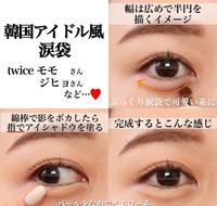 最后这种也是许多韩妞们最常画的卧蚕类型,即是中间粗、两头偏细,这样画完会让眼型看起来更圆润,整体显嫩、可爱,搭配眼妆时也较不容易被吃掉。先用修容色画完阴影后,将卧蚕打亮眼影色画在前2/3处即可。