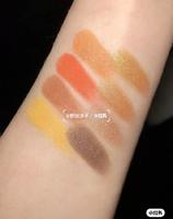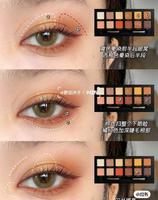 先用黄色晕染前半段眼窝,再用西柚色晕染上眼皮的后半段,再用棕色扫在整个下眼睑,橘红色加深在睫毛根部,最后用橘棕色的珠光上在眼皮中央、眼头以及前半段眼窝的凹陷处。