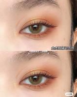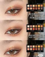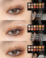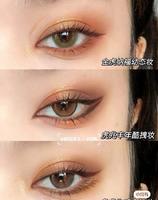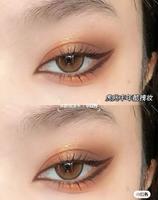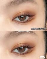 先使用鹅黄色+西柚色叠加打底晕染整个上下眼皮,再用棕色加深眼窝后半段及眼睑中间,棕咖色勾勒下至眼线,最后用棕色珠光叠涂在上眼皮中央、下眼睑前三分之一处、眼头。