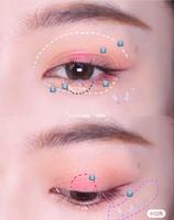 4.用浅粉色涂在下眼睑处,并在卧蚕处刷上一些亮片,双眼看起来就会清透水灵,最后在眼皮皱褶中间点上深粉色。